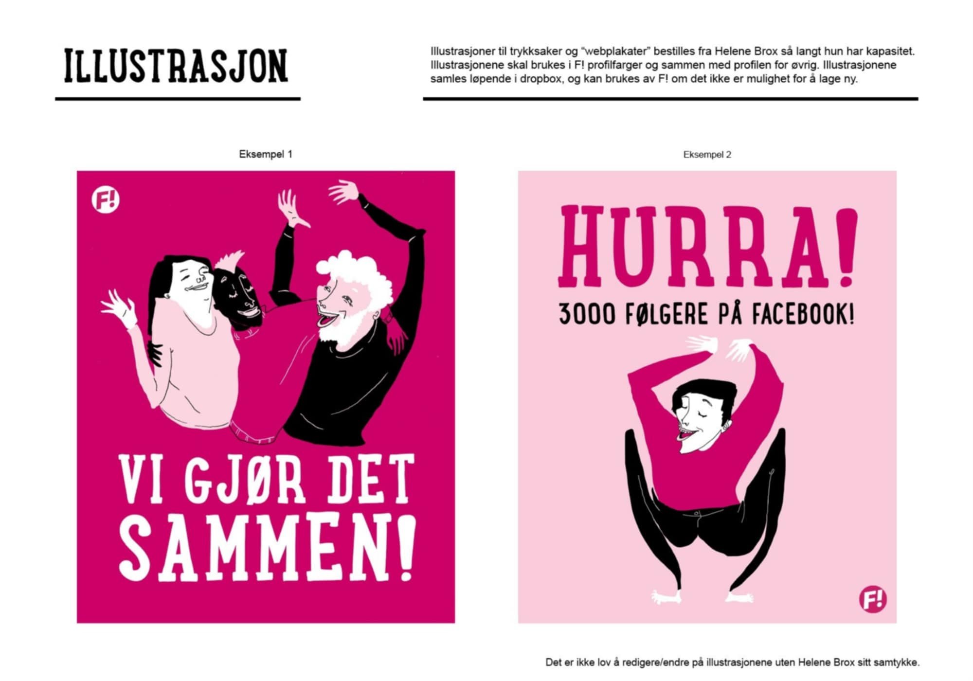 Da Feministisk Initiativ startet opp i 2015, laget illustratør Helene Brox, en egen design manual for partiet. Denne er ikke lenger i bruk i sin helhet, deler av den kan sees her som en kuriositet, og av og til gjenbrukes noen av detaljene, kreditert HB. Saker fra F! s opprinnelige nettside ligger lagret under fanen Feministisk Initiativ på denne nettsiden. Samtidig som den skal være lagret på Nasjonalbibliotekets pliktavlevering.